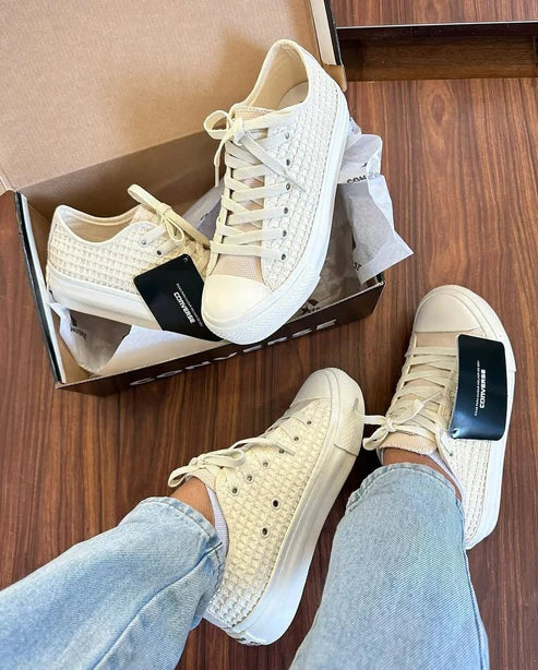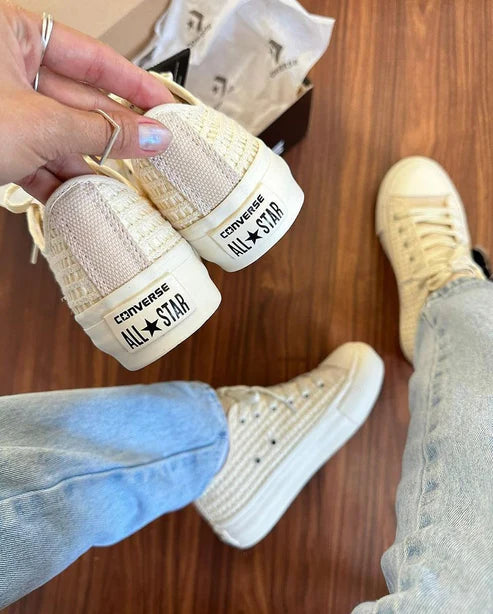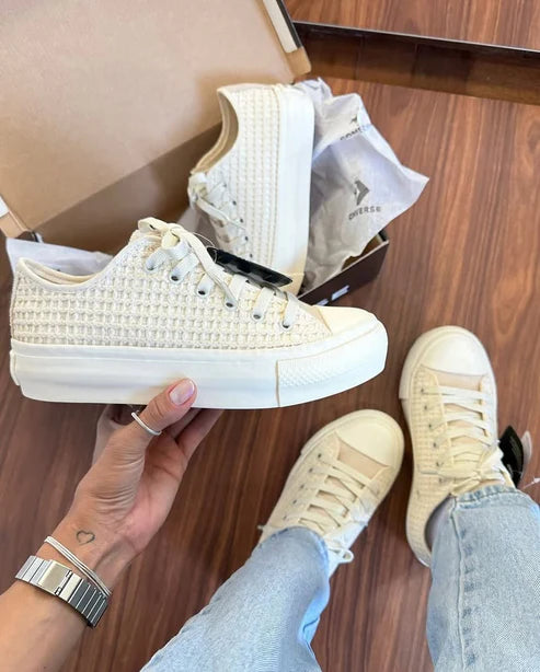 Eleve o seu estilo com o Tênis All Star Areia Renda Premium, um modelo exclusivo que traz um toque de moda e delicadeza para o seu dia a dia. Ideal para quem busca um calçado versátil e sofisticado, este tênis é perfeito para compor looks tanto casuais quanto mais arrumados.