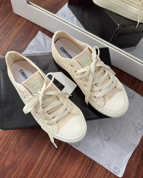 - Design Único: O Tênis All Star Areia Renda Premium apresenta um acabamento em renda na cor areia, proporcionando um visual charmoso e diferenciado.